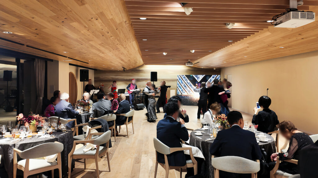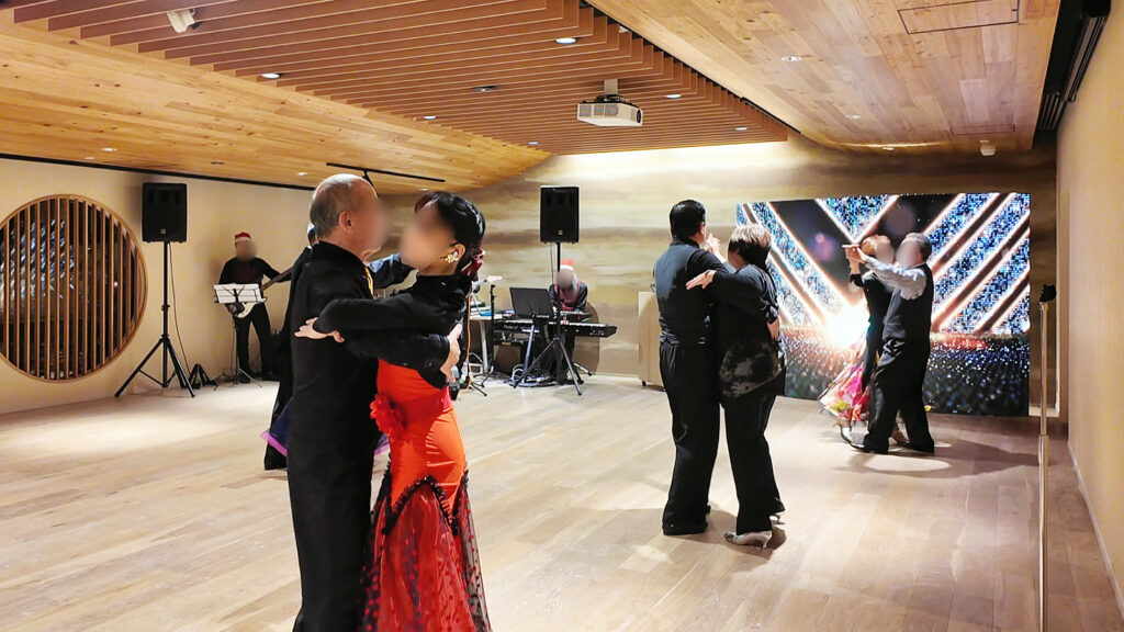 イベントの中心となる社交ダンスタイムでは、ダンス用の背景映像とクリスマス映像をシーンに応じて切り替えながら演出を展開。音楽やダンスの動きと調和した映像に加え、生バンドによる演奏も相まって、会場全体が一体となる華やかな時間となりました。