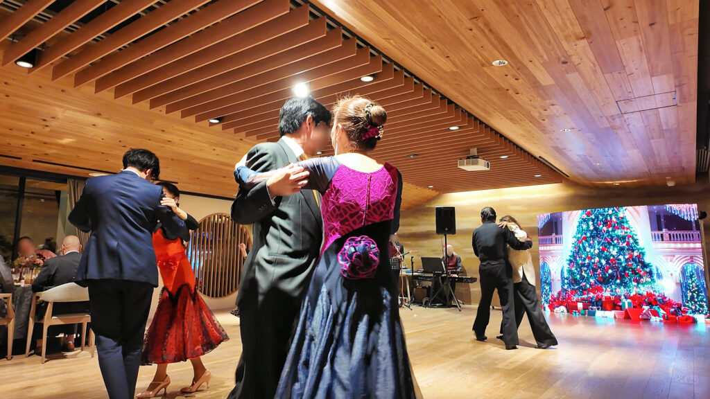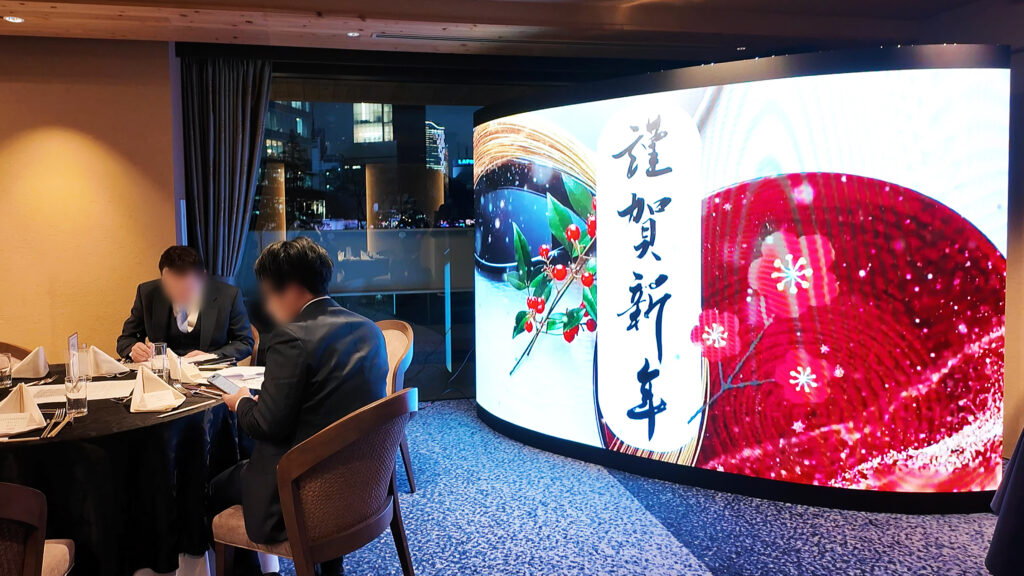 渋谷関税会主催のクリスマスパーティーにおいて、イベント全体の雰囲気づくりと一体感の演出を目的に、LIVESIONのLEDビジョンによる映像演出を導入しました。