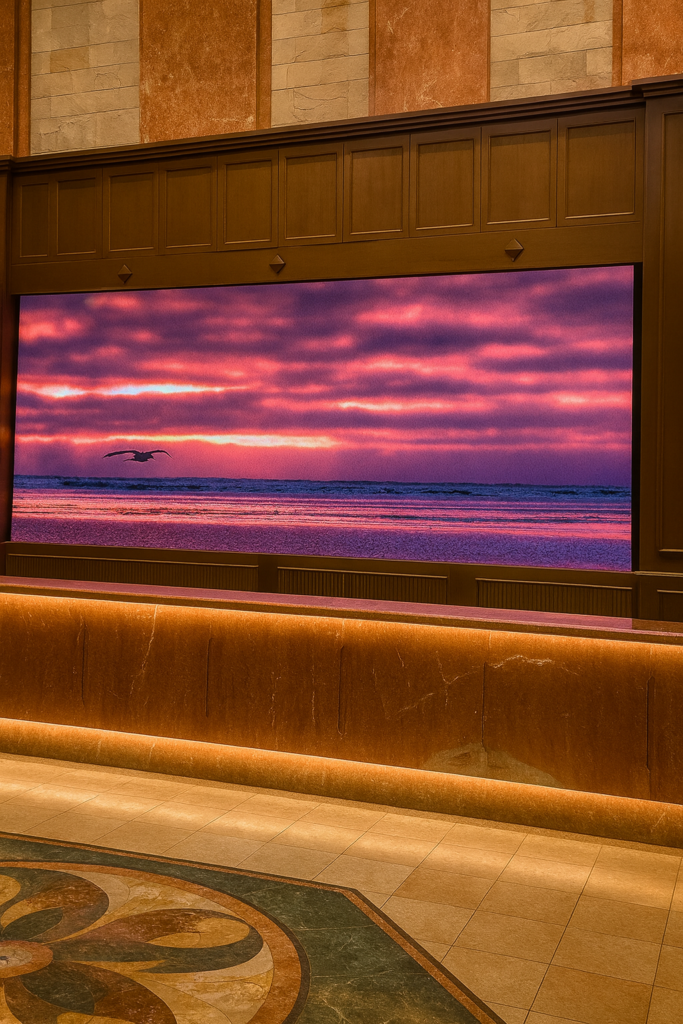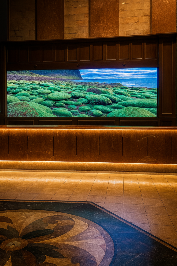 水槽維持費(月額20〜25万円)を大幅に削減しながら、北海道の自然映像やアート作品を映し出すことで、ロビー全体を美術館のような上質空間へ。